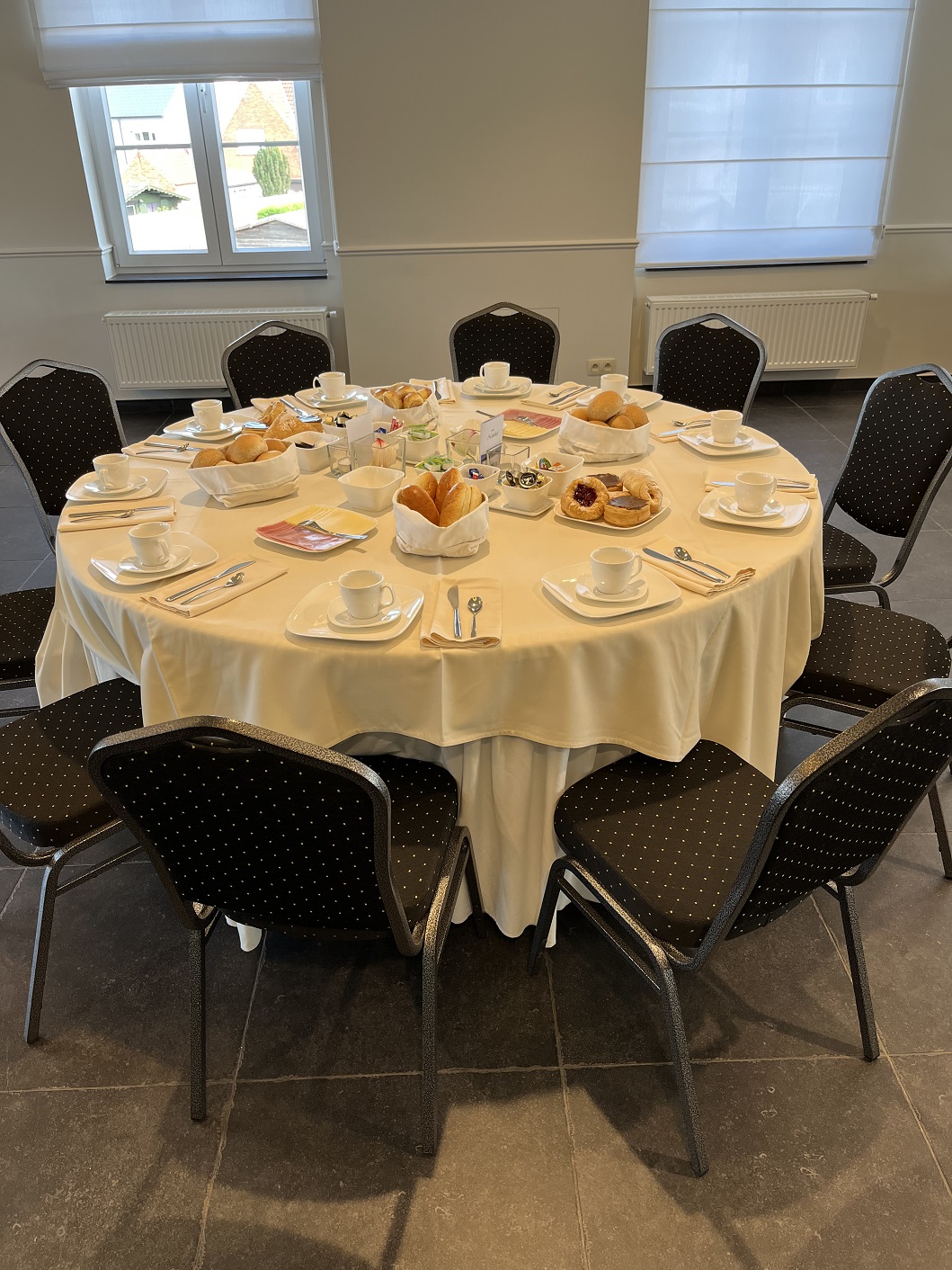 Ruime waaier van boterhammen, broodjes, sandwiches en koffiekoeken met zoet beleg, fijne vleeswaren, kazen, slaatjes, yoghurt en fruitsalade koffie, thee, melk, chocomelk en fruitsap.