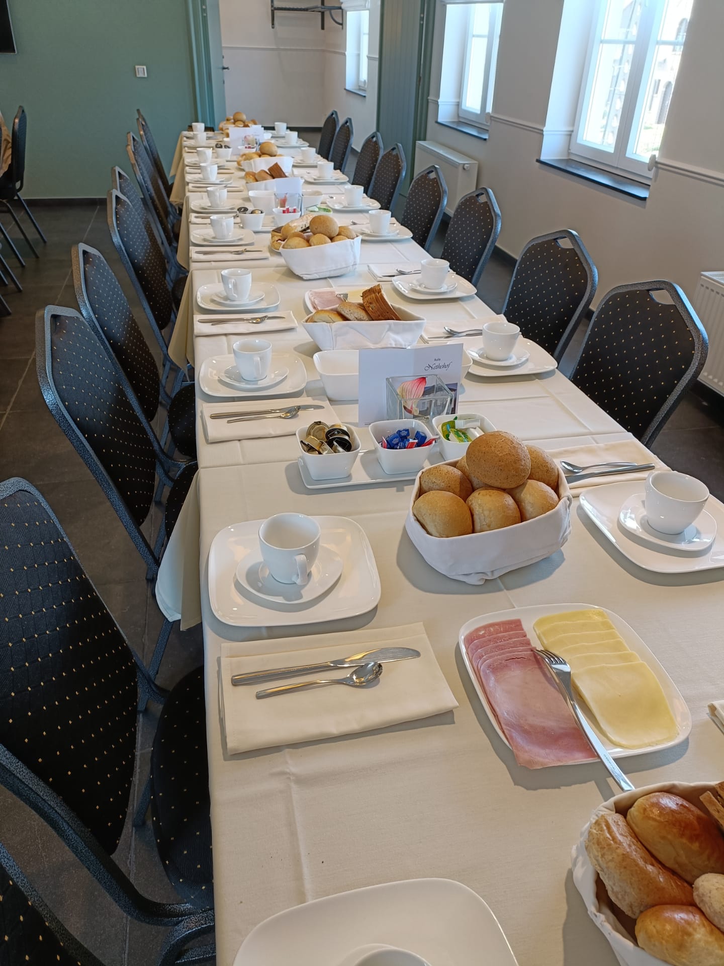 b) Pistolets, sandwiches, rozijnenbrood, kaas en hesp + koffiekoek
